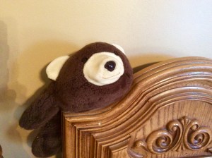 It would still look new today, but she caved into their son’s adorable chubby fingers reaching, his wide, loving eyes wanting nothing more than to squeeze that royal softness to his chest. The baby boy gummed the black felt right off the bear’s nose as he lay with it in his crib, then in his bed. One day, she noticed her son hadn’t touched the bear for a while, had moved on to other soft things. She rescued the nameless bear, used sharpie to fill in its nose, set it on her headboard.